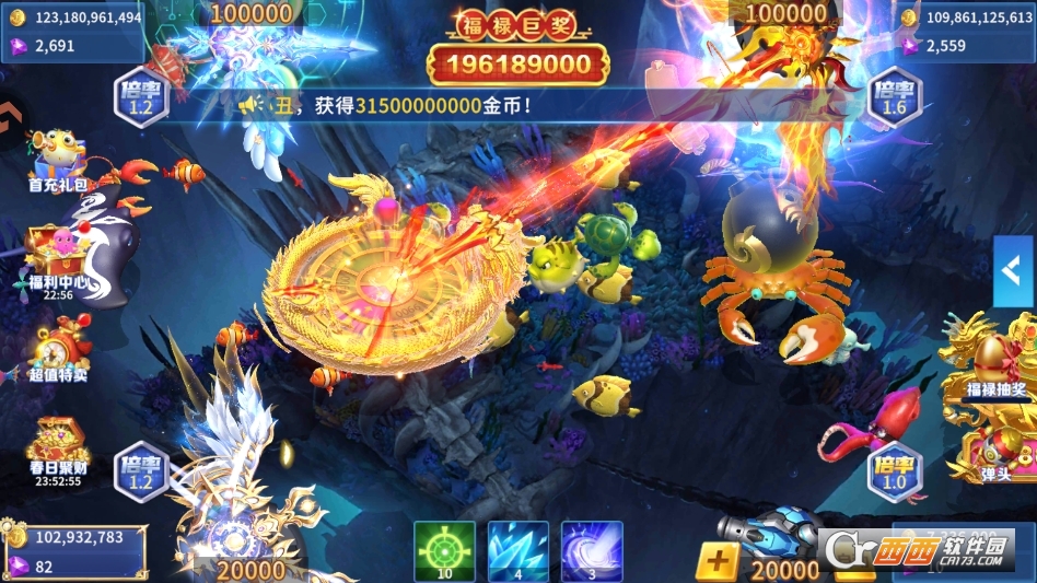 1. 经典捕鱼核心玩法:复刻线下街机捕鱼核心机制,玩家操控炮台,滑动调整角度,点击发射炮弹捕获各类鱼类,不同鱼类对应不同倍率奖励,捕获高价值鱼类与BOSS可获得海量金币,炮弹可自由切换倍率,从低倍到万倍随心调整,倍率越高,捕获奖励越丰厚,体验一炮爆亿金的快感。