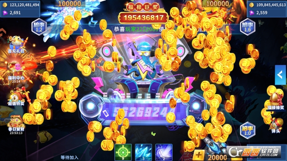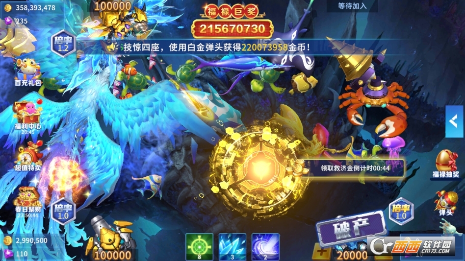 其次,沉浸感极强,3D建模打造的海底世界细节饱满,光影流转自然,鱼类游动逼真,搭配贴合场景的背景音效与技能特效,炮弹命中鱼类、触发狂暴模式时,全屏爆金与连击动画极具冲击力,仿佛置身线下街机厅,视听体验远超传统2D捕鱼游戏。