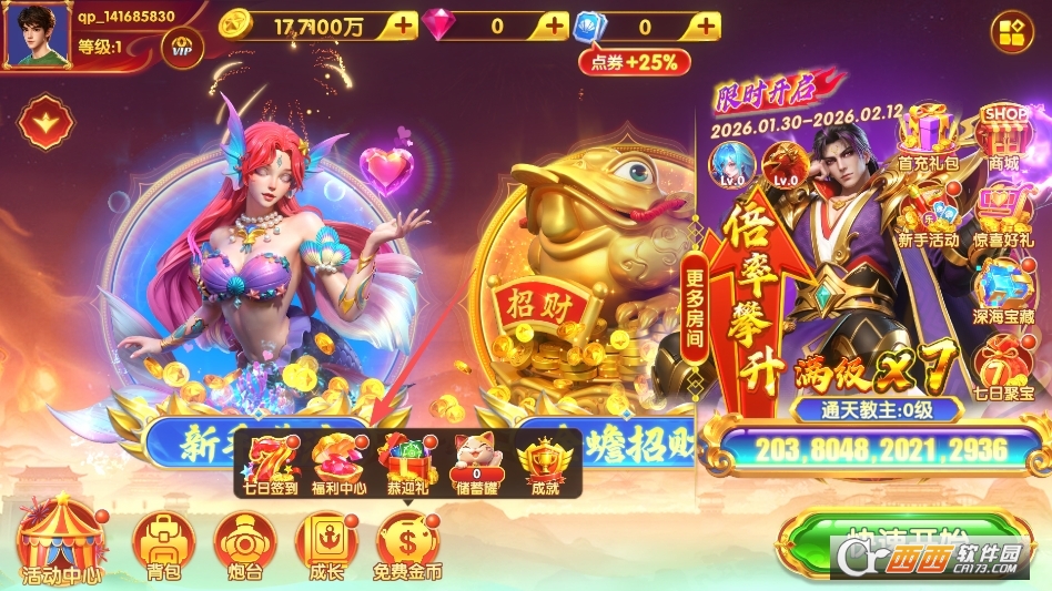 炮台养成与倍率升级:核心养成体系围绕炮台展开,捕获鱼类获取金币可升级炮台、解锁千炮 / 万炮等高倍率,搭配炮台皮肤、翅膀等外观装饰,兼顾实用性与个性化,提升捕鱼爽感。