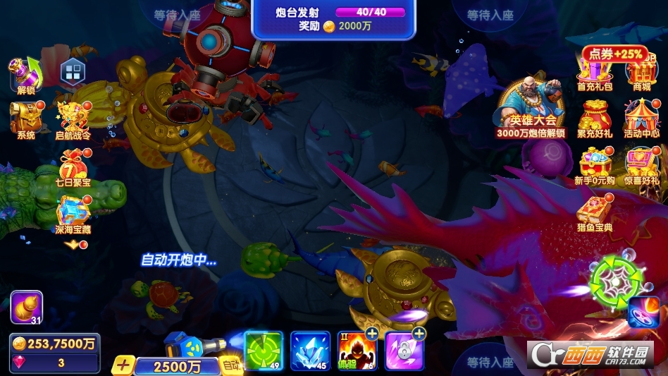 经典捕鱼模式:核心基础玩法,点击屏幕瞄准鱼类发射炮弹,炮弹消耗随炮台倍率递增,捕获鱼类获得对应金币,金币用于升级炮台、解锁倍率,是获取资源的核心途径。
