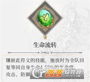 4、生命流转符文:橙色符文,作用是镶嵌此符文的技能,施放时为全队回复等同伤害XX%的生命值。这个符文目前也没有什么特别合适的使用场景,还有待进一步开发,新手同样先跳过不考虑。