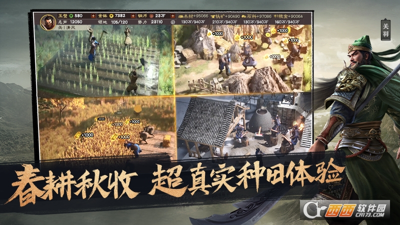 1、真实三国画卷:高清3D画风重现三国经典场景与人物,武将立绘精美,战场气势恢宏,沉浸感十足。