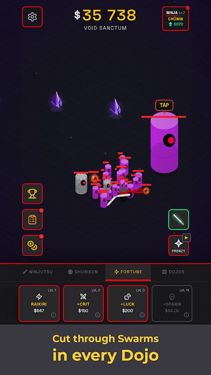 3. 持续成长乐趣无穷:击杀敌人、挑战更高难度竞技场、收集宝物赚取金币进行永久升级,完成任务获取经验值晋升忍者。支持离线进度,随时回归变强,不断挑战新关卡和道场,体验成就感十足的成长历程。