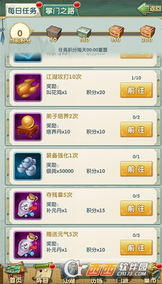 快速升级的基本要求是要不断提升实力,开局不能盲目的为了提升等级而进行江湖扫荡,这会损失很多资源。当卡在一关时,一定要对装备(血战可获得),武功(夺残章可获得),弟子进行相应的提升,这样才能体力最大化。