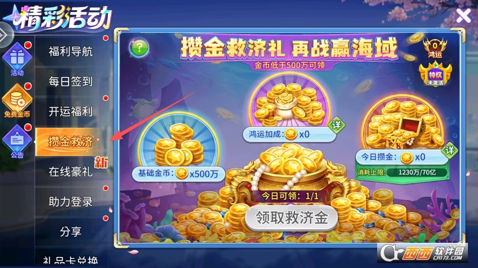救济金版块就在主页下方的免费金币版块里