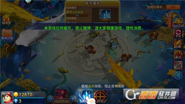 炮台升级与技能:消耗金币升级炮台火力(最高千倍),解锁冰冻、闪电、锁定等技能,关键时刻扭转局势。