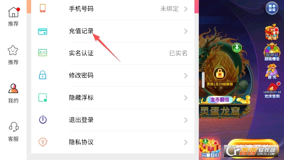 即可呼出系统菜单,点击充值记录选项即可进行查看