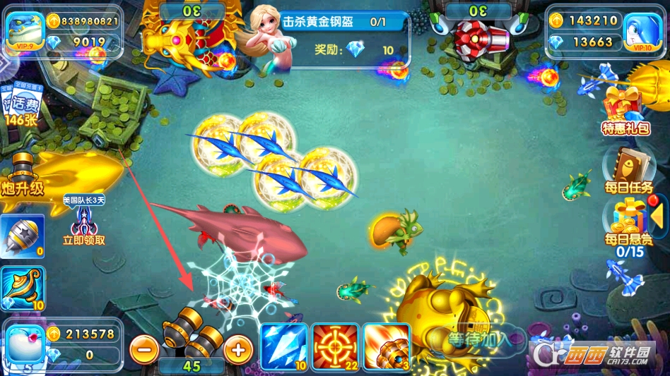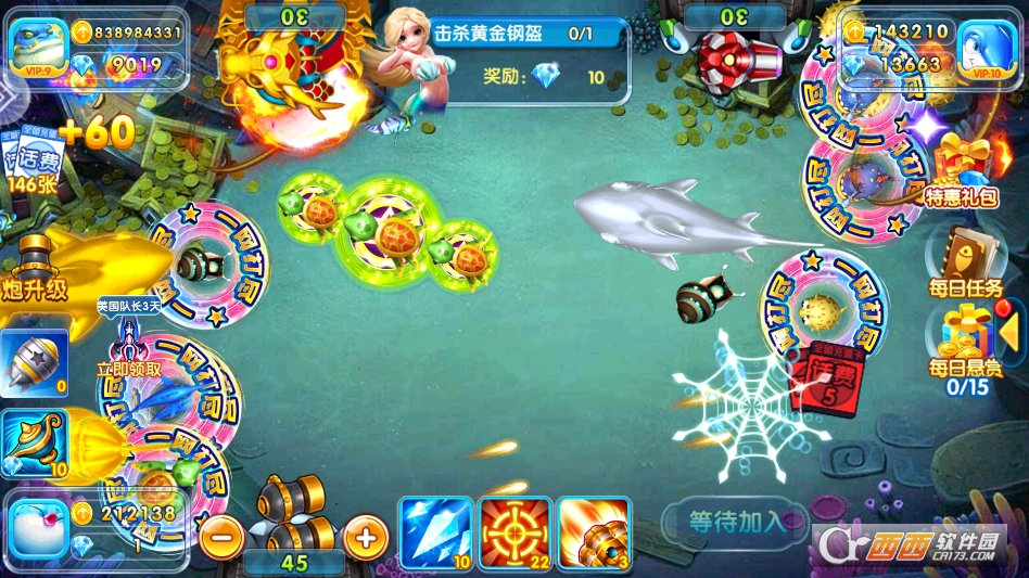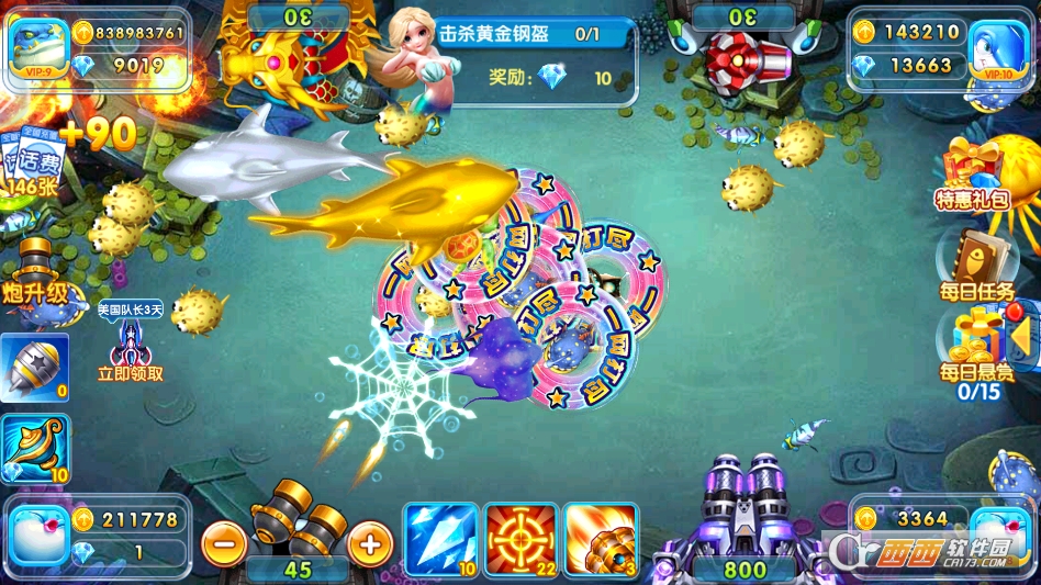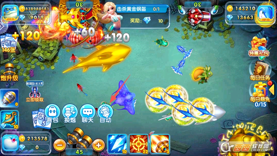 游戏定时刷新高价值深海 BOSS,单人可挑战。 也能邀请好友组队围捕,配合冰冻、锁定、狂暴等道具合击。 BOSS 被击败后必掉大额金币、稀有炮台、红包券等高阶奖励。 是快速获取顶级资源与福利的核心途径。