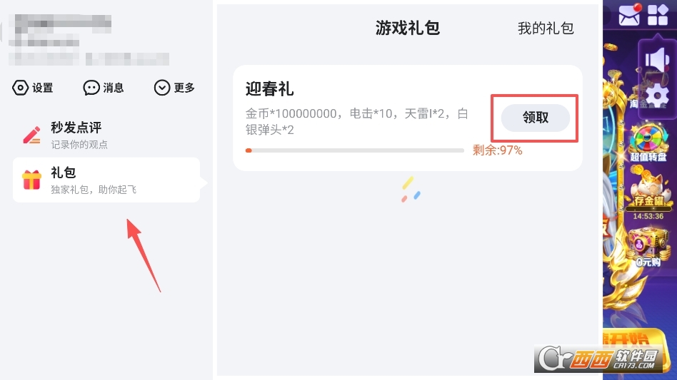 即可呼出菜单,点击礼包按钮,即可领取到各种礼包福利