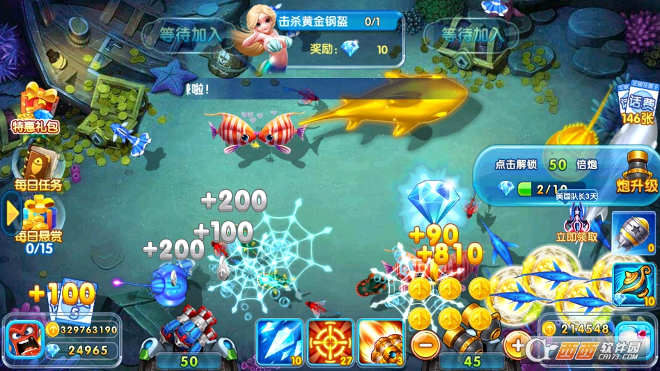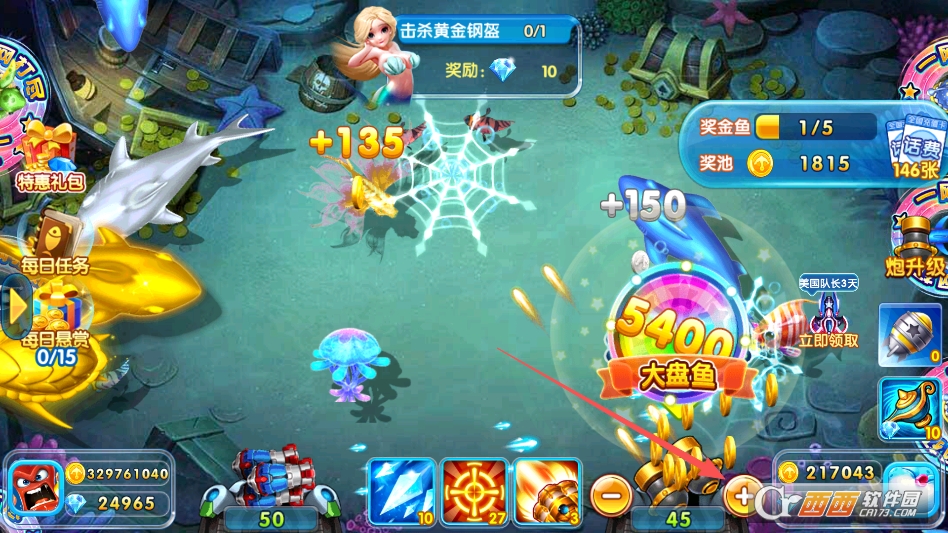 进入渔场之后,我们不断点击自己炮台右侧的+号按钮来提升炮倍
