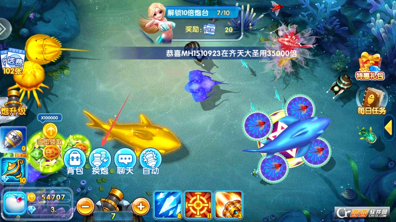 在游戏渔场中点击你的炮台呼出菜单,点击换炮按钮
