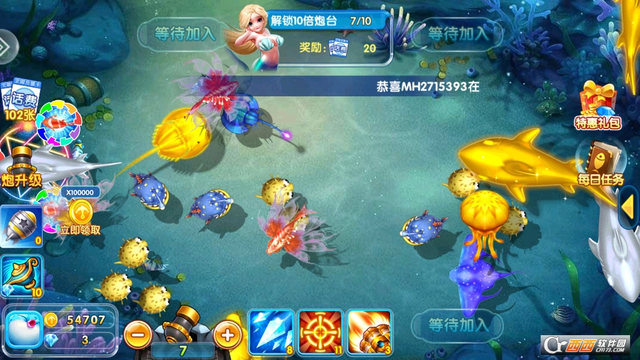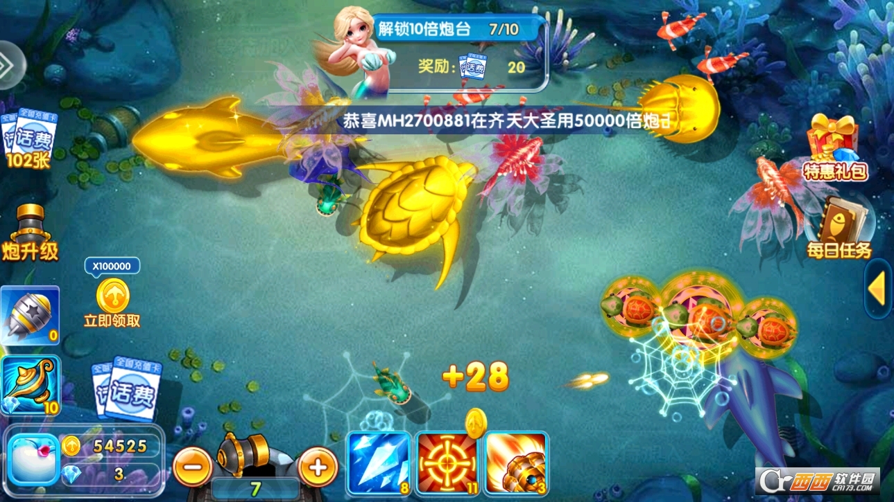 第二,专属技能,制霸更轻松。炮台与翅膀联动解锁的专属技能,涵盖范围伤害、锁定打击、爆率翻倍、全屏清场等多种效果,不仅能大幅提升捕鱼效率,还能轻松应对高难度鱼群与强力BOSS,新手也能快速上手制霸海底,爽感十足,彻底告别“捕不到鱼”的烦恼。