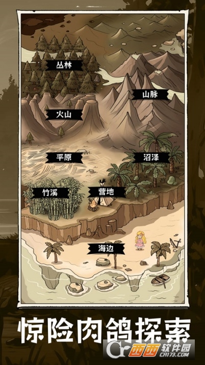 属性管理 + 区域探索:实时监控血量、饱食度、体力、精神与健康五大核心生存属性,属性过低会直接触发生存危机,外出可探索沙滩、雨林、火山等多样区域,探索过程会消耗体力,同时能收集各类物资并触发随机事件与野兽战斗。