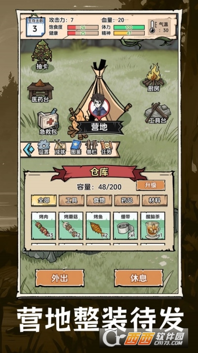 6、目前你仓库里空空如也,点击“外出按钮”搜寻物资吧;