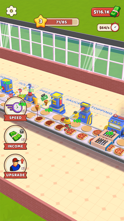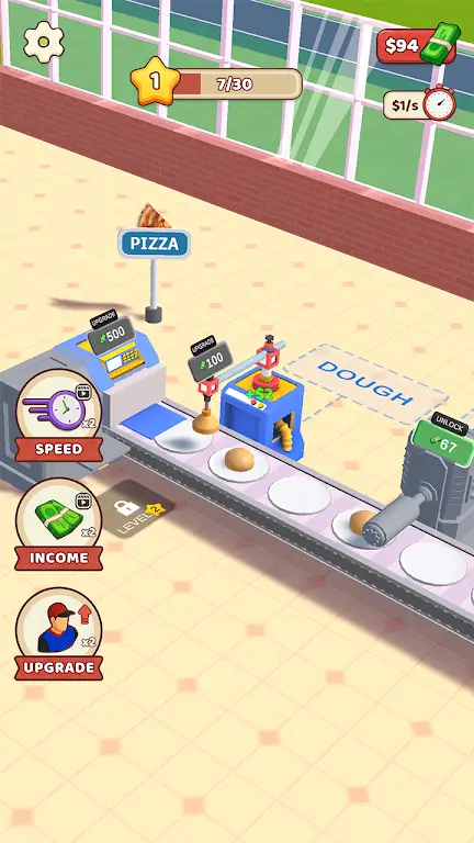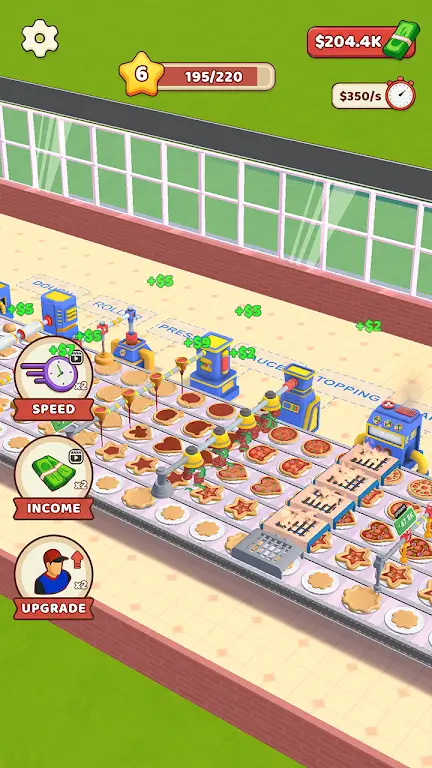 1. 自动化生产升级:游戏核心玩法围绕生产流程,从制作面团到烤制成型,每步都能升级机器提升效率。升级工人加快操作,购买新机器增加产能,实现流水线输出,工厂24小时不间断制造美味披萨,完成订单带来持续盈利,促进餐厅扩张。