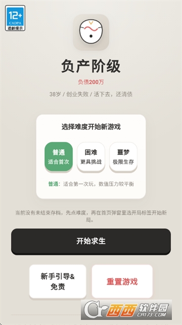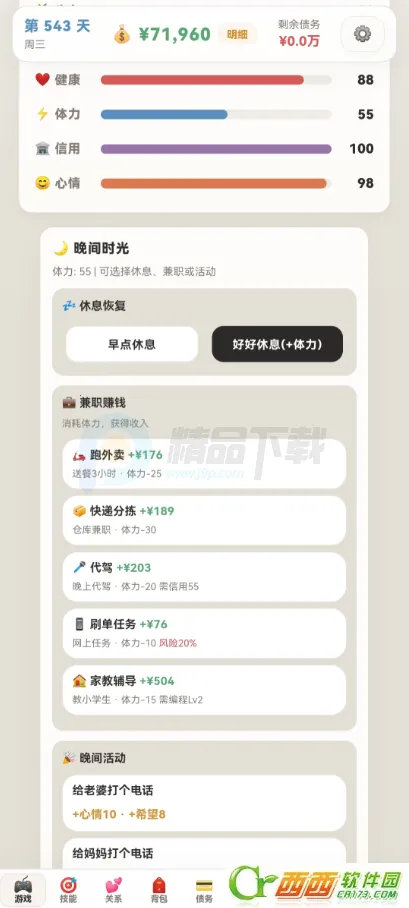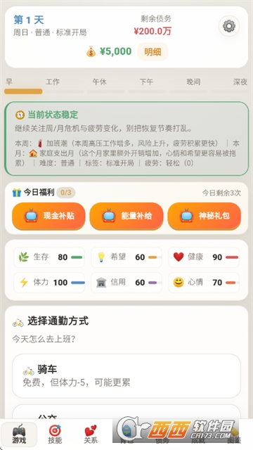 游戏中体验真实负债压力,玩家扮演38岁普通人背负200万元债务,面对持久月供压力、日常开销、身心疲惫和精神负担。多维度生存策略,不能仅靠工作收入,要尝试兼职、技能提升及与债权人协商,兼顾身心健康和精神状态。分阶段目标,初期求生存避免债务加深,中期找翻身策略减少负债,后期清偿债务后开启财富管理玩法。多样人生起点,不同起点决定初始负债、生活压力和心理状态,每个选择影响后续生活走向。