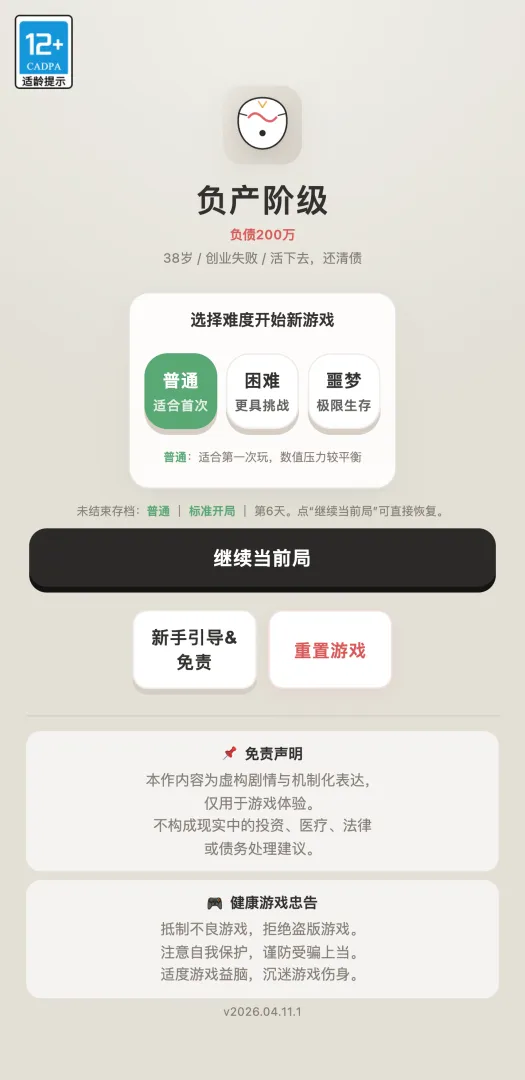 负产阶级是一款深刻反映现代负债生活的生存经营游戏。玩家扮演38岁背负200万元债务的普通人,体验在债务压力下撑过难关的历程。游戏直面现实中的欠款、疲惫、焦虑,强调在债务、健康、情绪与人际关系间找平衡。
