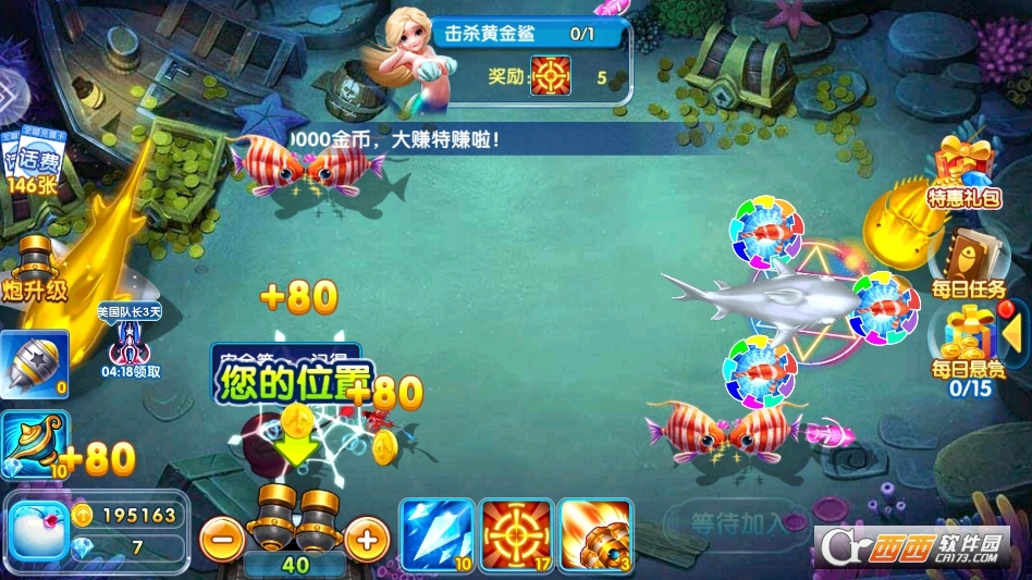 这是游戏的基础核心玩法,玩家可自由选择浅海、深海、秘境等多种特色渔场,单人独立捕鱼。操控炮台发射炮弹捕捉鱼群,捕获不同鱼类获得对应金币与道具奖励,炮台支持1-10000倍自由切换,搭配冰冻、锁定、狂暴等道具,轻松应对各类鱼群。可自由调节捕鱼节奏,适合碎片化时间休闲解压,新手可从低倍场起步,熟悉后挑战高倍场,体验满屏爆金的快感。