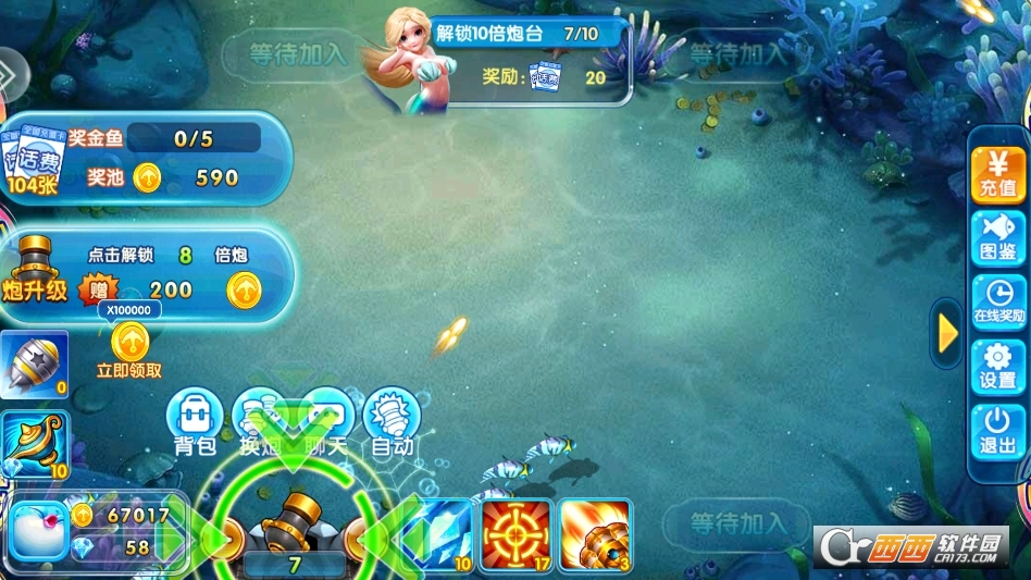 5.道具与炮台升级:玩家可通过捕获鱼类、完成任务,积累金币与道具,解锁更高级的炮台,提升炮台威力与捕获概率;同时可使用锁定、冰冻等道具,辅助捕获难以瞄准的鱼群,让捕鱼过程更轻松、更高效。