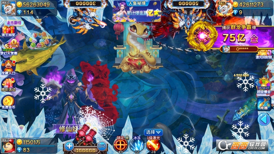 玩家可以解锁、升级超百种特色炮台,每款炮台都自带冰冻、锁定、穿透、狂暴、全屏爆破等炫酷技能,在鱼群密集或者遇到BOSS时释放技能,能大幅提升捕获效率与爆金收益。