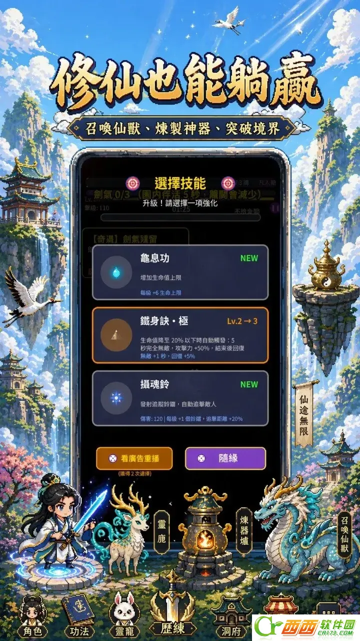 3. 修仙之路多阶段境界提升,从凡人期开始突破多个境界,每个境界有专属场景和敌人,境界提升增加难度与沉浸感。