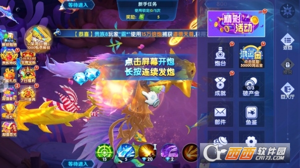 竞技场冲排名:每日免费参与3次竞技场,选择高倍率+连发策略,集中攻击高价值鱼群。