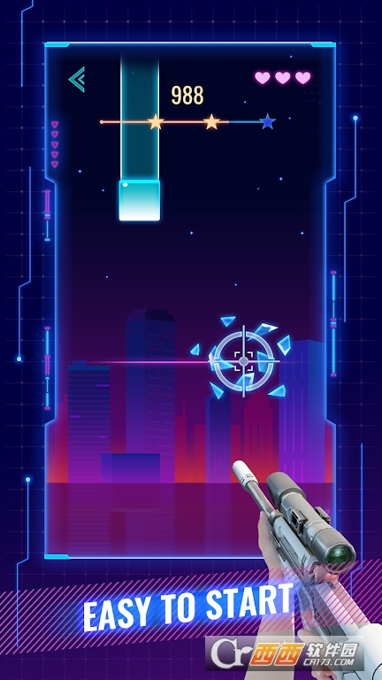 操作简单易上手:玩家只需按住并拖动屏幕瞄准目标音符,等待音符靠近时,枪会自动射击,同时还需注意捕捉音符,避免错过而失去生命值。