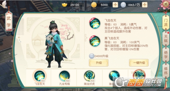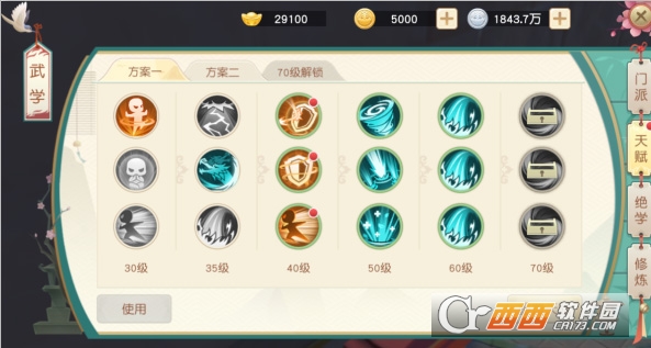 每个门派都有极具特色的技能:4个普通技能,4个强化技能,1个终极技能;4个普通技能和4个强化技能一一对应。门派技能随着等级提升解锁,通过消耗银币可以提升单个技能等级。