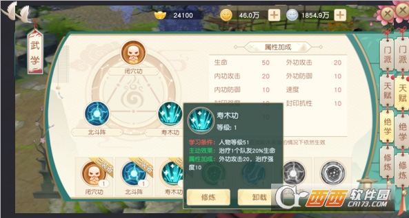 每个绝学都有特有的效果,总共三个位置可以装备绝学,战斗中使用绝学主动效果。学习绝学后可以为主角增加属性。绝学未装备时,属性也会生效。