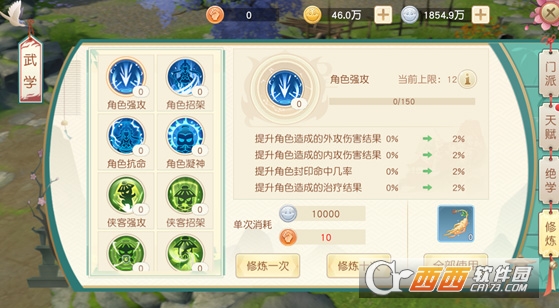 修炼可以提升角色、侠客、宠物的百分比属性;修炼上限与人物等级有关。每次修炼会消耗银币、帮贡、秘参、鹿茸、灵芝等。
