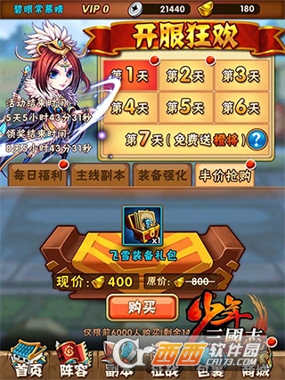 第一天礼包飞雪装,买不买看个人喜好,开服时间越久400金越不值。第二天8个宝箱400元宝,因为商店的宝箱价格是递增的,第一个宝箱价值30金,8个宝箱半价实际上是比商店出售的价格便宜的。第三天精炼石必买,10元宝一个精炼石,价值永固。第四天的天命石看个人需要决定买不买,花费1500金。第五天的2000将魂半价比较超值。顺便说一下将魂,一个橙将80个碎片,决定国家之后神将商店刷出碎片,本国橙将一定要买下,一个不落,凑缘分突破都要用到,因此1个武将决定一个国家是很仓促的,慢慢决定阵容才是上策。