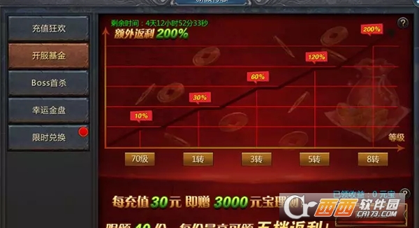 新区活动很多。最福利的当属基金和轮盘。基金大家每充值30元即可获得赠送一份基金。40份封顶。升级到对应等级获得对应元宝奖励8转累计可得200%奖励 40份共计24万元宝。
