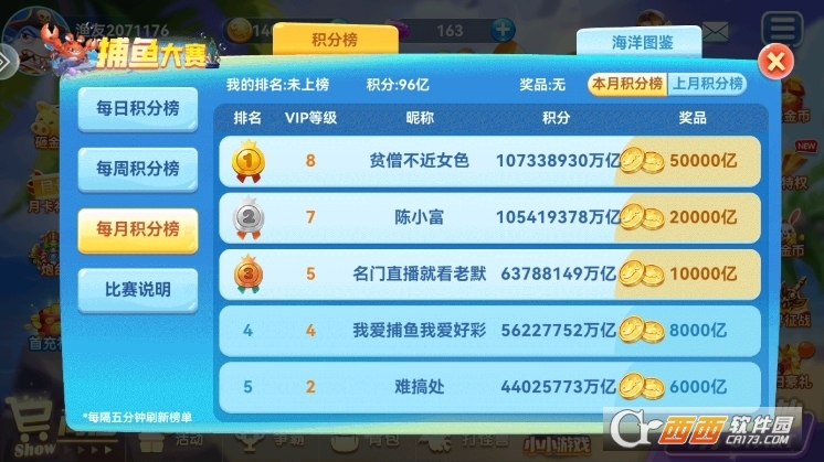 4、竞技比赛:设有渔王争霸榜等竞技模式,根据玩家在渔场内的捕鱼成绩进行排名并发放奖励。