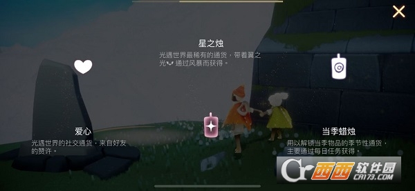 游戏世界中有很多蜡烛,点燃它们或者接近点燃的蜡烛,我们就能收集到烛光,收集满一根后点击就可以铸造一根新的蜡烛。点击游戏界面的左上角可以看到我们拥有的蜡烛数量。从左到右依次是普通蜡烛、季节限定蜡烛、爱心。这3个是游戏中的货币。其他人赠送给自己蜡烛时,我们就可以获得爱心。