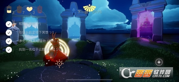 找到黄色人影,与它们互动 收集“光之翼”,我们的 飞行技能就可以得到 升级――斗篷背后 星星的数量就代表我们的飞行级别。