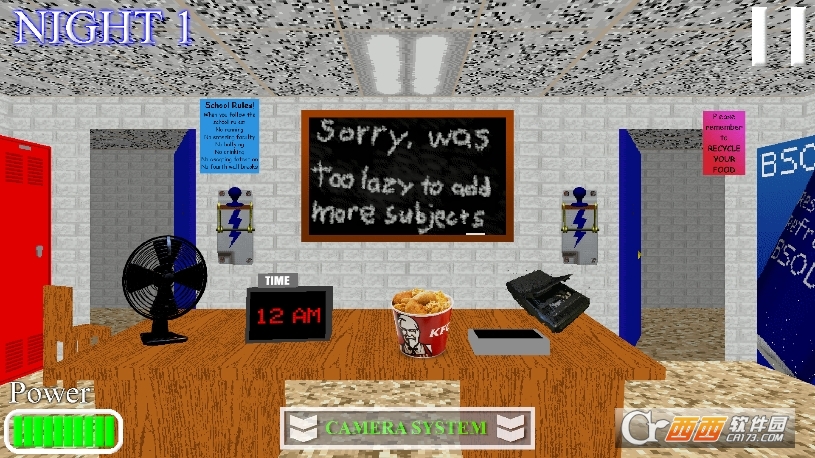 2、生存挑战机制:采用经典的生存挑战玩法,玩家需要在连续五个夜晚中,躲避巴迪老师和其他怪物的追捕,努力生存下来。游戏内设有监控系统,玩家可以通过监控屏幕观察学校各个角落的情况,提前预判危险。同时,玩家还需合理管理有限的电力资源,一旦电力耗尽,监控系统和灯光将会失效,大大增加生存难度,为游戏增添了紧张刺激的策略性。