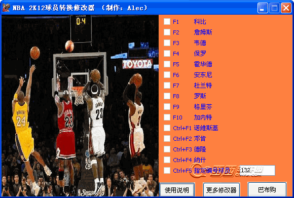 使用说明:1、进入MP模式按F12弹出修改器,选择要转换成球员即可。2、请在选秀后使用此功能,选秀前未测试3、本修改器用于任何MP名单,但只有在初始名单下保证修改的球员是你想要的球员,其它名单可能会有偏差。4、如果修改器未列入你要修改的球员,请在指定编号球员中输入要修改的球员编号,0-14左右为76人球员,15-29左右为山猫球员,依次类推。