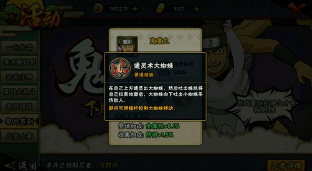 鬼童丸是签到忍者应该是C级忍者,技能攻击力可能不是非常高,感兴趣的玩家可以通过签到收集鬼童丸碎片。