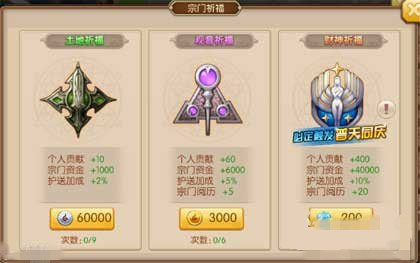 2.祈福后可获得相应的奖励:宗门贡献、宗门资金、护送加成。