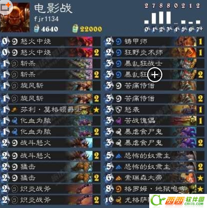 苦战傀儡:这是版本更新之后我非常喜欢的卡,战士版本的残影,也可以理解为第三张战斗怒火,在打出组合技之后,起到补牌的作用,而且战士的受伤手段非常多,经常一张傀儡可以补充到满手的牌,想比较战斗怒火,傀儡费用高了一费,但是傀儡可以稳定拿到场面上,你需要的已知的牌,战斗怒火是过牌库里未知的牌,所以个人觉得这张牌和怒火各有各的优势,在不同情况可以发挥不同的作用,而且有了这张牌,生奴隶就有了无限的可能,别人奴隶战最多两波,有了傀儡可以生3到4波,注意一点,单独回手奴隶意义不大,除非技能找到火球,重点是食尸鬼和炎术师和奴隶一起回手。实测两张会卡手,只带一张。