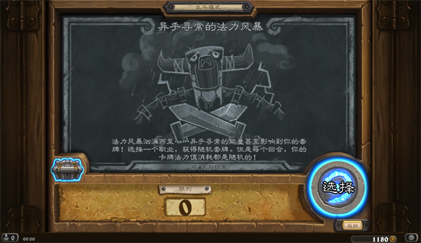 法力风暴汹涌而至……异乎寻常的能量甚至影响到你的套牌!选择一个职业,获得随机套牌。但是每个回合,你的卡牌法力值消耗都是随机的!