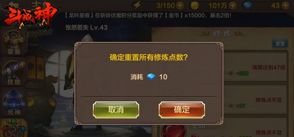 点击修炼界面右上角的重置按钮,我们就可以重置当前所有修炼点。重置功能在角色未达到40级之前是免费使用的,而且不限制次数。40级之后每次重置就是消耗一定数量的钻石,但是收费很少,甚至可以忽略不计,非常亲民。