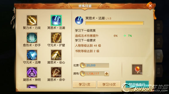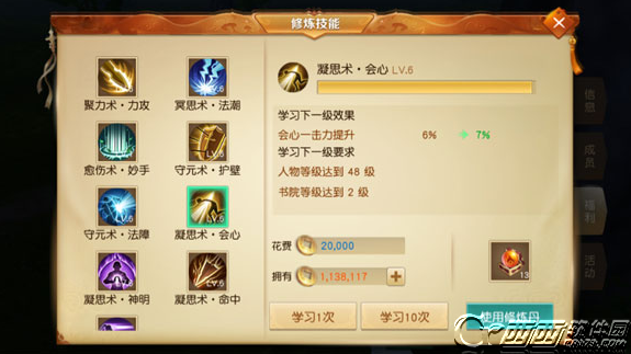 因此,在这里我主要介绍的是大家最常的玩法—纯输出型的云麓。正由于云麓是法师,擅长法攻,所以首要的势力技能修炼就是选择冥思术·法潮。跟其他输出型角色一样,除了主要的加攻击,还需要加会心一击力。因此,凝思术·会心也是必不可少的技能。