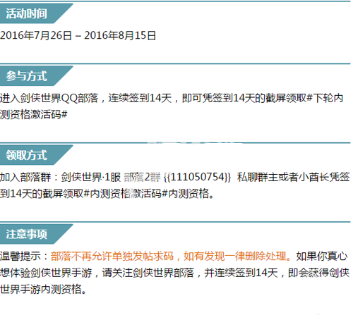 1、目前最靠谱也是最容易获得的,在2016年7月26日 – 2016年8月15日到剑侠世界的QQ部落进行签到14天,之后把截图发给部落群群主或者是小酋长就能够获得激活码,部落群号(111050754)