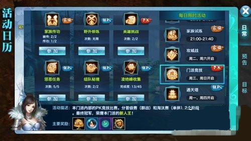 首先,我们了解门派竞技的基本概念。门派竞技是指各个门派之间举行的赛事,需玩家达到30级以上方可参与,通过群战以及淘汰赛进行选拔,最终第一名将会获取到门派新人王的称号,并获取到大量的奖励的活动。当然了,参与者也会获取到一定的奖励,例如水晶、门派信物、珍贵的魂石等。