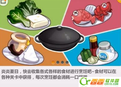 炎炎夏日,快去收集各式各样的食材进行烹饪吧~食材可以在各种关卡中获得,每次烹饪都会消耗一口锅哦!