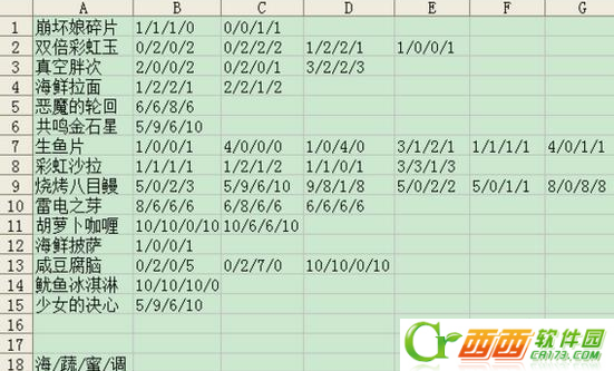 各个烹饪都有多个配方,从左到右的数字为:海鲜/蔬菜/蜜汁/调料