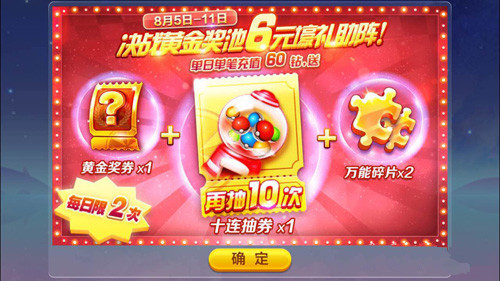活动内容:活动期间,游戏内每天单笔充值满60钻石(不含返利部分),送十连抽券*1+黄金奖券*1+万能碎片*2