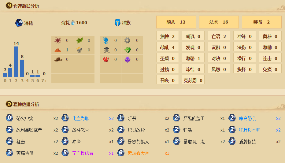 说实话。这套来自于欧服的狼人战,在卡组构成上可以说非常成熟,亮点在使用炎术士与命令怒吼的清场搭配上,相对于传统狼人战的乱斗清场方式,更加灵活,并且与卡组其他卡牌之间的配合相性非常好,配合苦痛过牌、战斗怒火过牌能极大的加强狼人战的清场与过牌能力,在面对铺场型职业如动物园、控场萨满、导演德的时候,炎术士与两张食尸鬼简直是救世主一样的存在并且能在解场的同时配合战斗怒火低费补牌。而低费法术之间的互相配合相性也非常好,怒火中烧、化血为脓不仅仅与炎术士能搭配,配合苦痛过牌,配合食尸鬼、猛击、小斧头补刀也十分好用。以至于笔者与很多玩的不错的朋友在对这套卡组进行调整的时候甚至找不到可以调整的卡牌。