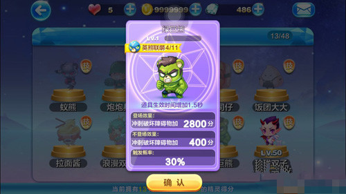 而绿巨熊的登场效果则是冲刺破坏障碍物加分2800分